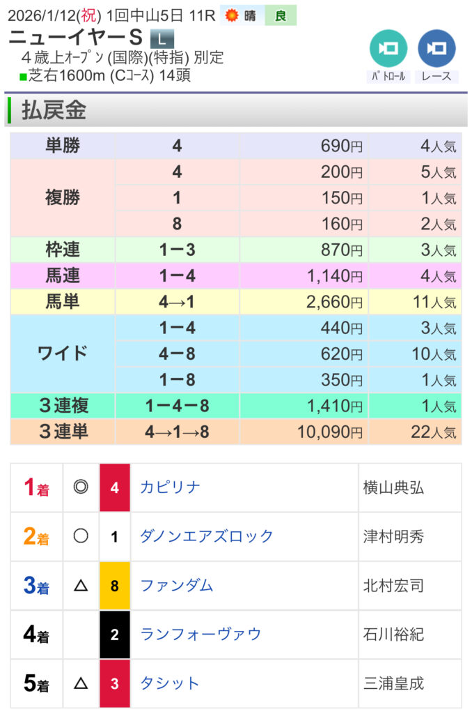 今回の記事では、2026年1月12日 中山11R ニューイヤーステークス で的中した馬券を振り返りながら、