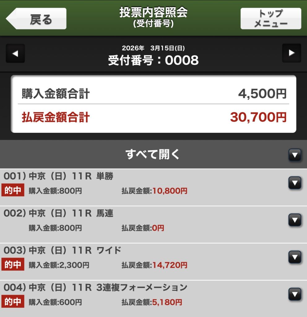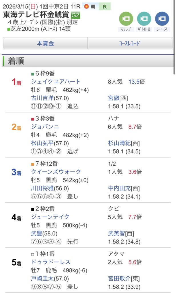 今回の記事では、2026年3月15日(日)中京11R 東海テレビ杯金鯱賞(G2・芝2000m)で的中した馬券を振り返りながら、